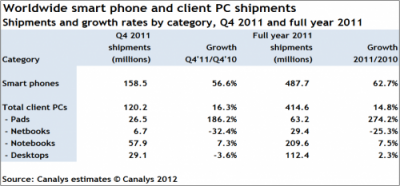 Canalys. Впервые в истории смартфоны обошли объемы отрасли персональных компьютеров, которая увеличилась за год всего на 15 процентов, достигнув числа поставок в 414,6 миллионов устройств. И это включая планшеты. Кстати последние показали в сегменте персоналок лучшие результаты – рост в 274 процентов. Аналитики при этом повсеместно прогнозируют дальнейшее улучшение результатов.