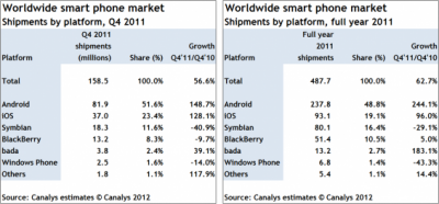 Canalys, за прошедший квартал все участники отрасли отгрузили 158,5 миллионов смартфонов. В среднем рост за квартал составил 57 процентов по сравнению с аналогичным периодом прошлого года. Мировой рынок смартфонов в 2011 году получил порядка 488 миллионов аппаратов в целом. Показатель увеличился с прошлого года на 63 процента. И здесь кроется главный вывод аналитиков из