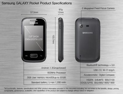 Samsung Galaxy Pocket стал обладателем дисплея диагональю 2,8 дюйма. Его работа осуществляется на простейшем процессоре с тактовой частотой 832 МГц под управлением операционной системы