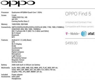 Порцию достоверной информации о характеристиках Oppo Find 5 опубликовали западные издания, ссылаясь на рекламные материалы производителя. Итак, смартфон будет наделен 5-дюймовым дисплеем на основе матрицы высокой четкости с ppi 441 точек при разрешении 1920 x 1080 пикселей. Защита для дисплея используется самая передовая - Gorilla Glass 2.