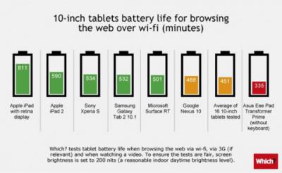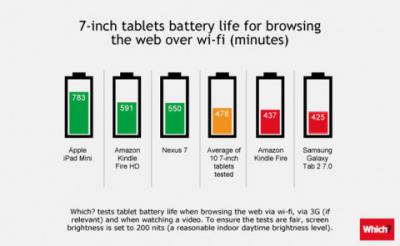 Which?" решил испытать планшеты. В отбор попали те устройства, которые обладают дисплеем диагональю 7 и 10 дюймов. Условия также одинаковы для всех: проводилось подключение по Wi-Fi и яркость дисплея устанавливалась на отметке 200 нит. В результате проведенных двух тестов первое и второе места заняли
