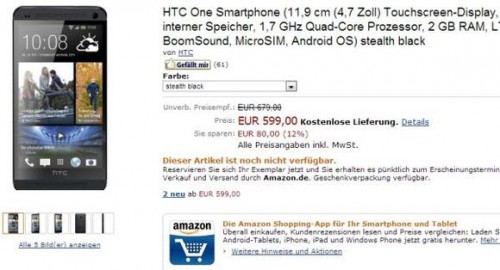 HTC One, стоимость которого снижена с 679 евро до 599 евро.