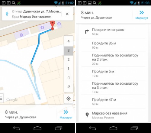 Еще одним нововведением является голубая точка, показывающая в городе местоположение человека с точностью до нескольких метров. Причем, если он начнет перемещаться по этажам, то карта автоматически обновится. При помощи функции «Проложить маршрут» пользователь окажется в нужном месте, указав на карте только точку. По словам