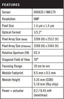Digital Optics. Известны некоторые его характеристики: разрешение 1/3.2"-сенсорной матрицы — 8 мегапикселей с диафрагмой f/2.4.