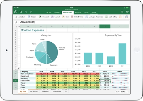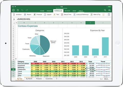 Как и в настольной версии офисного пакета, все приложения Office получили аналогичные функции. Например, в Word пользователь доступно изменять цвет текста и шрифт, делая его жирным, наклонным и подчеркнутым, а также вставлять диаграммы, таблицы и ссылки к тексту, использовать буфер обмена. В Excel владельцу iPad предлагается воспользоваться специальной клавиатурой, облегчающей ввод формул. При обновлении данных введенные значения в ячейках будут пересчитываться в автоматическом режиме (это касается и диаграмм). Третье приложение PowerPoint может похвастаться многообразными эффектами для слайд-шоу (на экране планшетного компьютера можно запускать созданную презентацию).