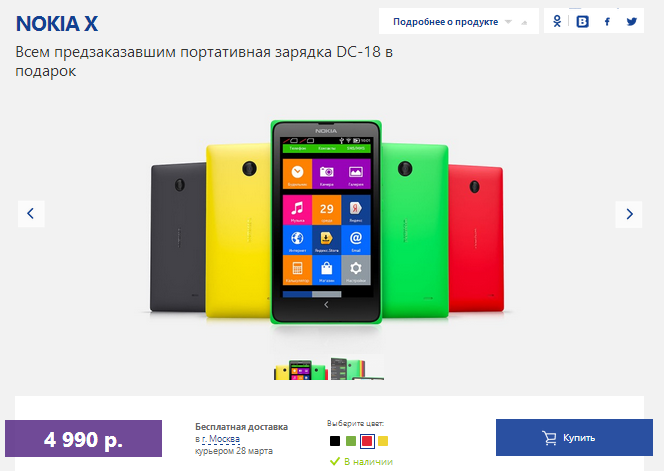 Nokia X. Приобрести его можно на официальном сайте производителя по привлекательной цене – 4 990 рублей. Покупателю новый мобильный аппарат предлагается в яркой гамме: в черном, красном, зеленом и желтом цветах. Со временем в продажу поступят и два других устройства. Уже сейчас пользователи могут оформить предварительный заказ на большой