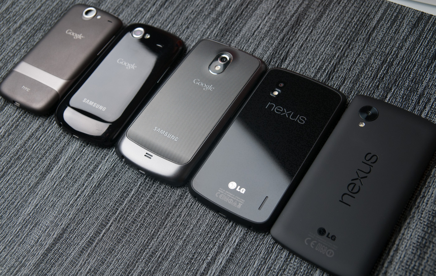 Эталонные" Android-смартфоны Google слева направо: Nexus One, Nexus S, Galaxy Nexus, Nexus 4, Nexus 5