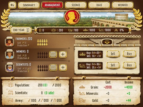 Empire Manager помещает один из главенствующих народов античности – римлян или египтян. Разработчики предусмотрели и еще одну сторону — воинственную и кровожадную, очень сложную в контролировании цивилизацию викингов. Со временем в игру введут больше играбельных народов. Из разбитой кучки людишек строится целая империя. Обещаны стратегические элементы уровня серьезных глобалок «