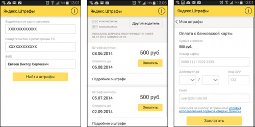 Для получения информации о наличии или отсутствии штрафов пользователю нужно заполнить все поля: фамилия, имя, отчество и номер водительского удостоверения собственника или владельца автомобиля, а также необходимо указать номер свидетельства о регистрации транспортного средства и нажать кнопку «Найти штрафы». Если таковые имеются в базе данных ГИС ГМП, то на экране аппарата отобразится результат с подробным описанием: когда выписан штраф, какое правило водитель автомобиля нарушил и до какого числа погасить задолженность. Для оплаты картой нужно ввести в соответствующие поля ее данные и нажать на кнопку «Заплатить».