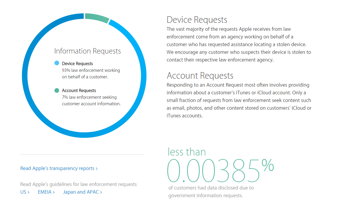 Apple уверяет, что тем самым не нарушает законы и не предает свое государство, а наоборот идет навстречу к пользователям — каждый имеет право на личное пространство. Обеспокоенность компании о собственном будущем вызвана еще одном фактором — только за первое полугодие она получила более двухсот запросов из спецслужб США с требованием раскрыть персональные данные отдельных аккаунтов.