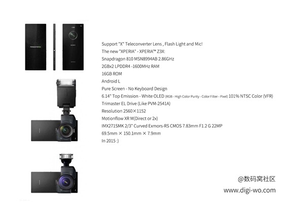 Exmor-RS IMX271SMK для передачи четкого изображения, качественной видео- и фотосъемки. В спецификациях указано, что сенсор получит огромным по смартфонным меркам размер 2/3 дюйма с диафрагмой f/1.2.