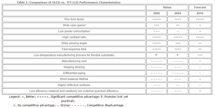 Таблица преимуществ OLED-матрицы перед TFT за последние 15 лет