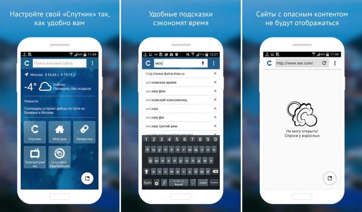 Спутник» имеется блокировка опасной для детей, по мнению экспертов, информации. На этой странице отображаются сведения о причинах создания препятствия к доступу. Однако при необходимости можно продолжить дальнейший серфинг в Интернете, пропустив блокировку. Так, например, в «детском режиме» родители поставят пароль на изменение настроек и навсегда запретят потенциально опасные ресурсы. Из браузера выполняется быстрый доступ к медицинскому и коммунальному сервисам проекта «