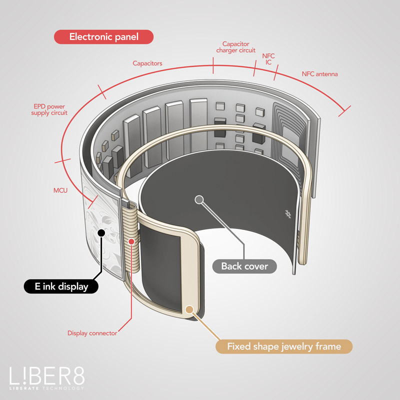В рядах носимой электроники пока немного разновидностей девайсов: фитнес-трекеры, смарт-часы, очки дополненной реальности, с недавних пор заявлены еще и устройства слежения за здоровьем. Но в скором будущем к ним присоединятся и украшения. Так, стартап L!BER8 превратил в наручного помощника браслет Tago Arc с изогнутым долгоиграющим E-Ink экраном, на который станет выводиться черно-белое изображение с различными украшающими одежду пользователя фонами.