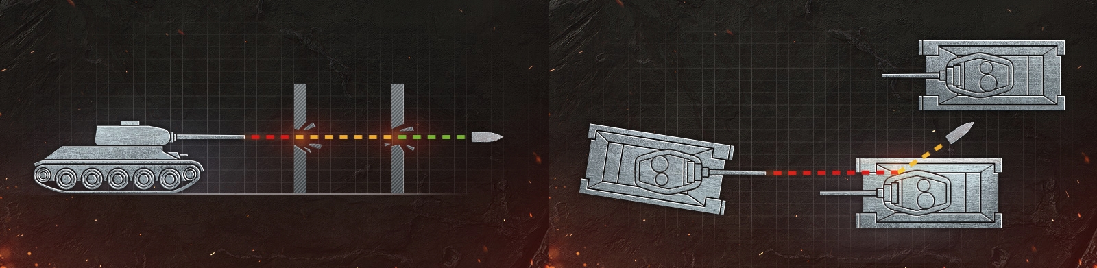 Если бронебойный или подкалиберный снаряд попадает в преграду или любой небольшой разрушаемый объект типа забора, то пробивает его насквозь и продолжает нести опасность для вражеской техники со сниженной величиной бронепробития (чем выше прочность объекта, тем ниже эта величина), при этом наносимый урон не снижается. Данное нововведение потребовало переработки большинства игровых карт. Рикошет происходит однажды и также снижает величину бронепробития снаряда (примерно на 25%). Полет отрикошетившего снаряда ничем не ограничен.